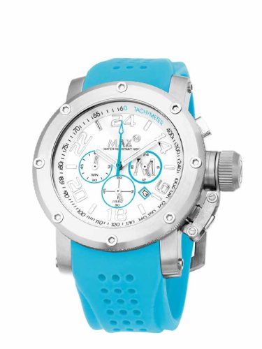 #A 24-hour wristwatch by MAX Watches - offering a quartz chronograph movement, stainless steel case and aqua rubber strap. stainless steel hands and numbers accent the classic white face. The 3 chronograph dials and date window complete its simple, elegant design. This watch is water-resistant to 50 meters, has scratch-resistant mineral crystal and comes with a 2-year warranty - protecting against any manufacturing defects.